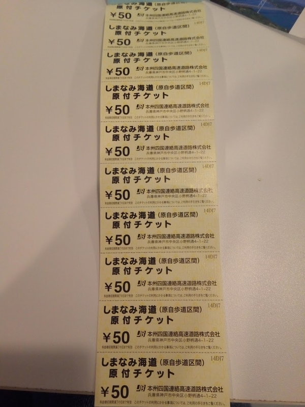 しまなみ海道は合計500円で本州四国間を横断することができるのですが、橋の料金内訳は来島海峡大橋200円×1、多々良大橋100円×1、その他50円×4となっており、50円が大量に必要です。